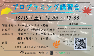ut.code(); は工学部丁友会と合同で、東京大学の学部生および大学院生を対象にプログラミング講習会を以下の通り実施いたします。 概要 HTML・CSS...